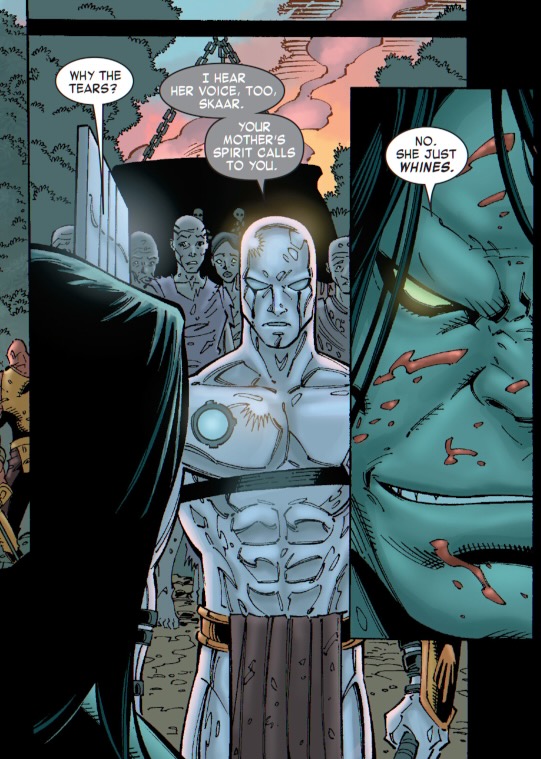 After this, Galactus appears and eats Sakaar, killing everyone–including the innocents Skaar vowed to protect. Skaar sees that if he hadn’t been so consumed with rage, he could have listened to Silver Surfer and evacuated the planet before Galactus’ arrival.