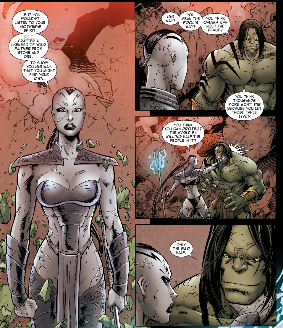 Caeira, Skaar’s mother, speaks to him psychically and tries to get him to stop. Silver Surfer can hear her voice, too. She even disguises herself as Hulk in an (unsuccessful) effort to curb her son’s bloodlust, and when she can’t do it, she (as Hulk) teams up with her son.