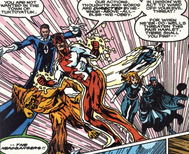 At the end of #92, the Fantastic Four figure out that Headlok from West Coast Avengers #10 is in Canada and head up there to take him down. He mind-controls some members of Alpha Flight so there’s lots of fighting.