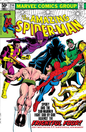 Spider-Man and Namor team up to fight a new iteration of the ever-changing Frightful Four. This time, it includes an Atlantean: Llyra, the woman who tried to depose Sub-Mariner as King of Atlantis and murdered his bride, Lady Dorma.