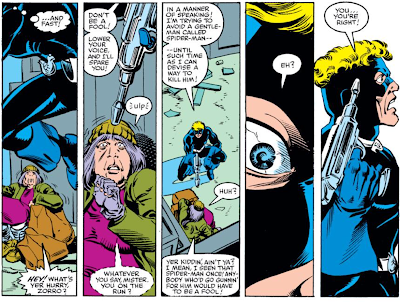 Anyway, this is the story where the bubbling-under subplot of Greg Salinger, a weirdo student in Peter Parker’s teaching assistant class at ESU, is finally revealed to be Foolkiller.