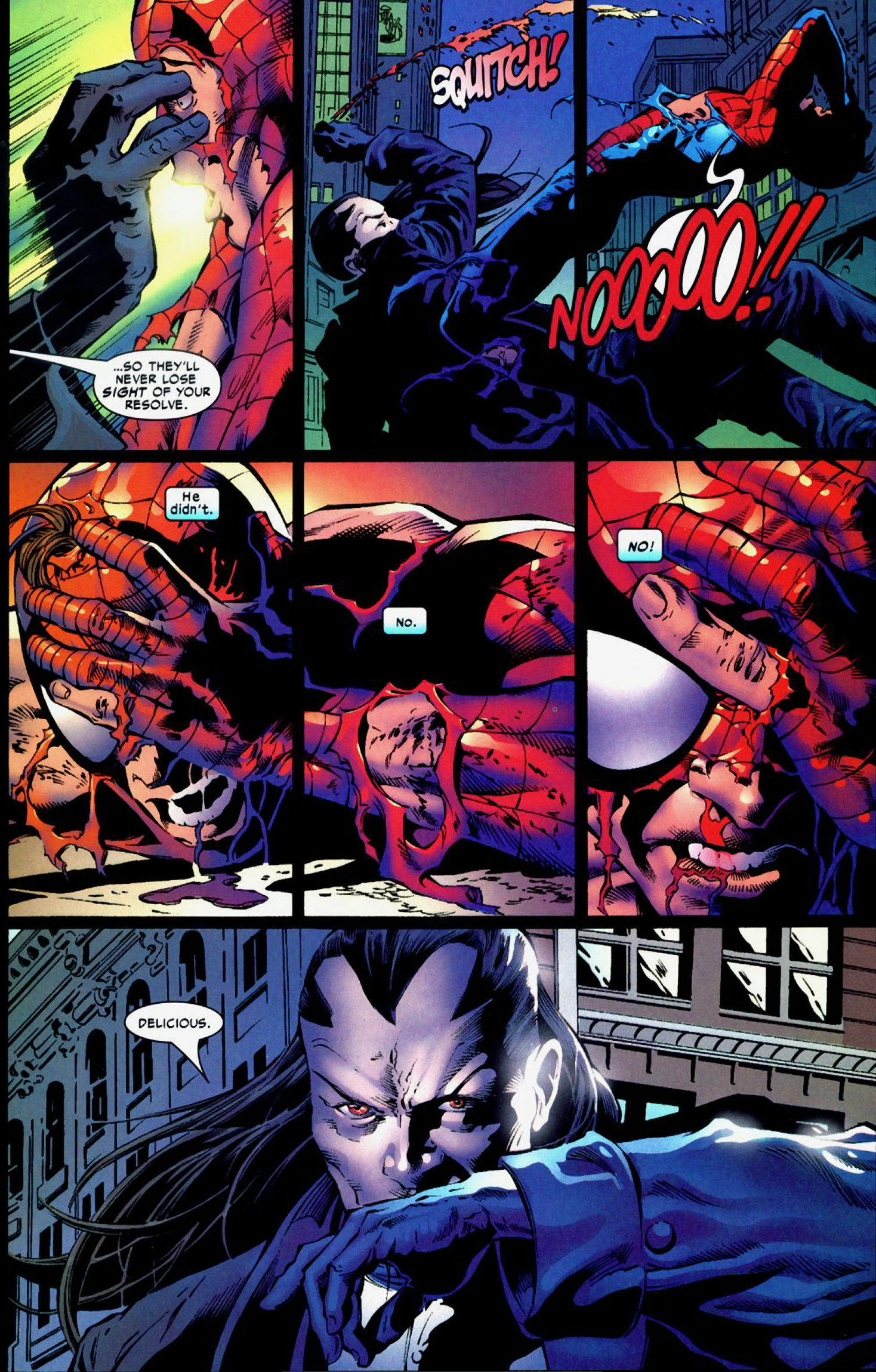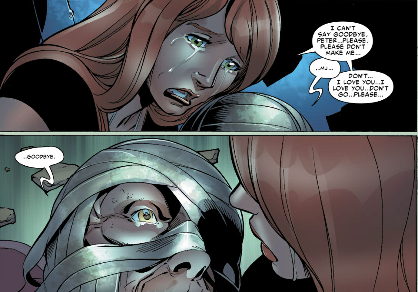 A second confrontation with a completely bandaged Morlun leaves Morlun dead and Peter dying. He says goodbye to Mary Jane…