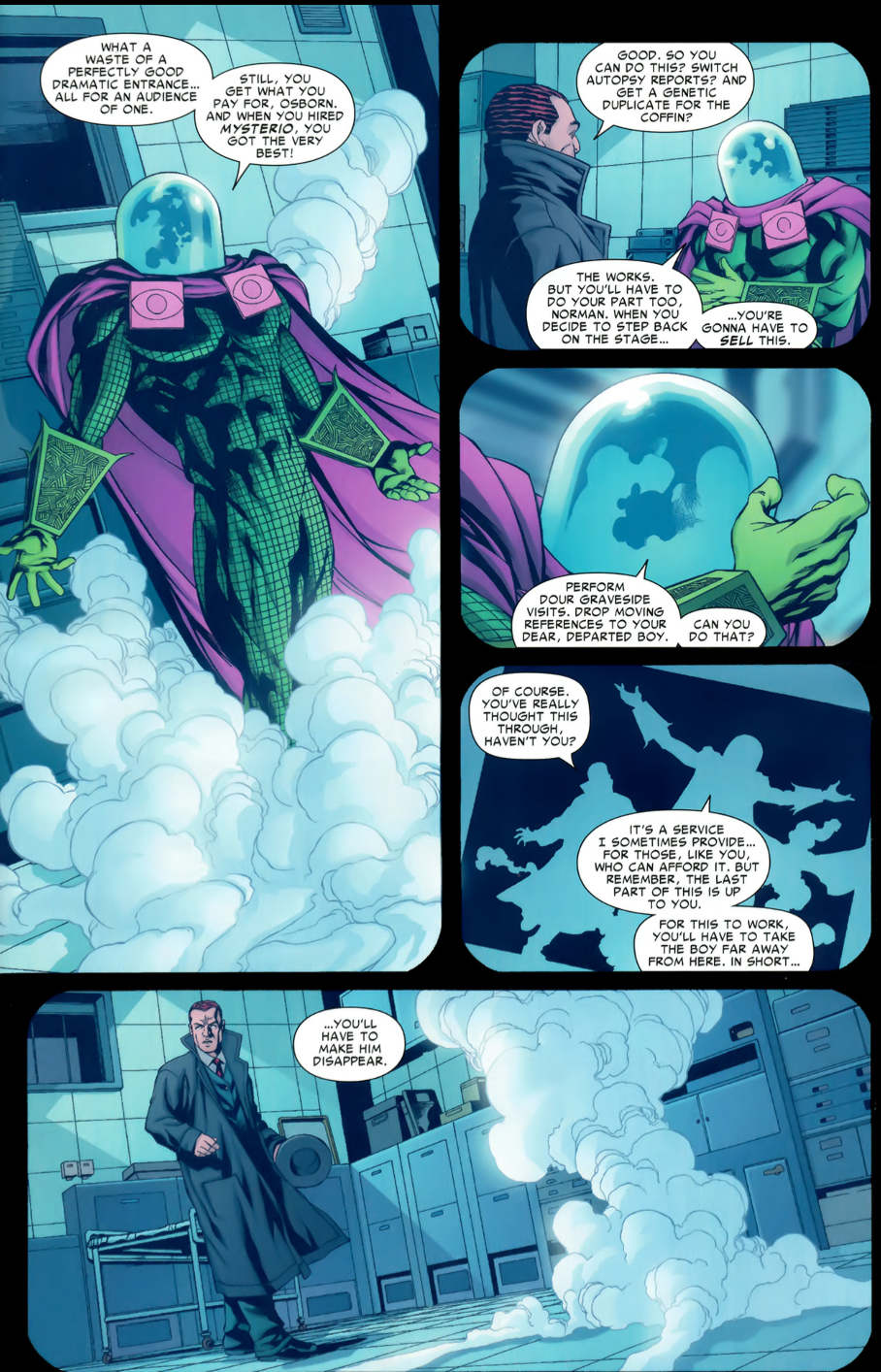 What matters, though, is not the fight.  Over the course of the story, Harry relates that when he seemingly died from taking Goblin Serum back in PPTSS #200, he actually only seemed to be dead but woke up in the morgue where his daddy–also then thought dead–arranged for Harry to disappear, with the help of Mysterio…