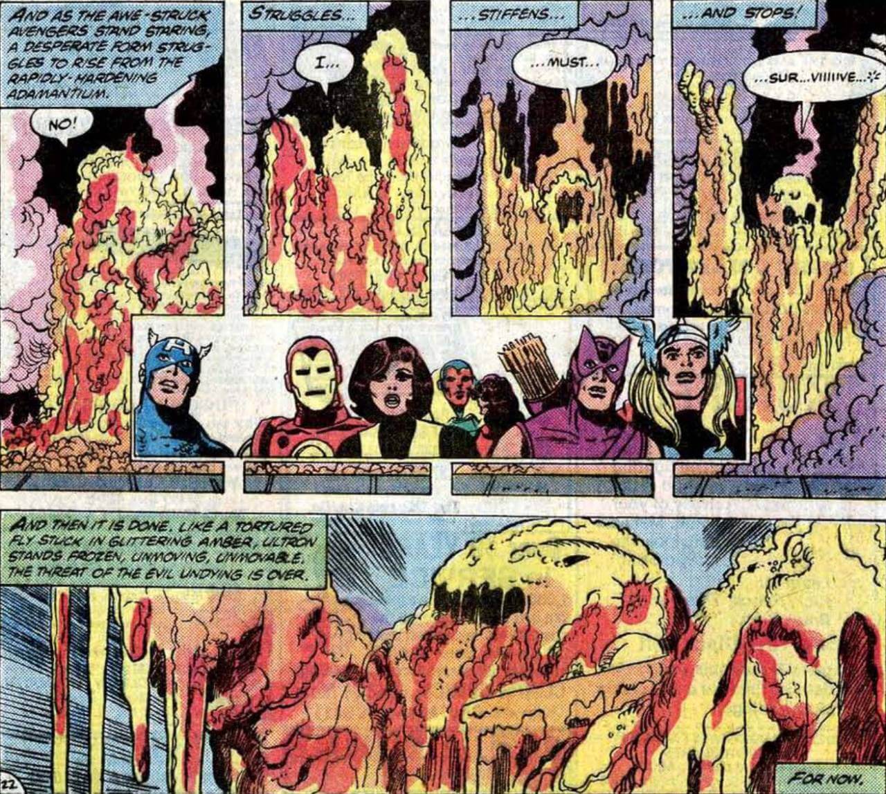 In the end, Ultron is encased in molten metal–much like the end to Terminator 2.