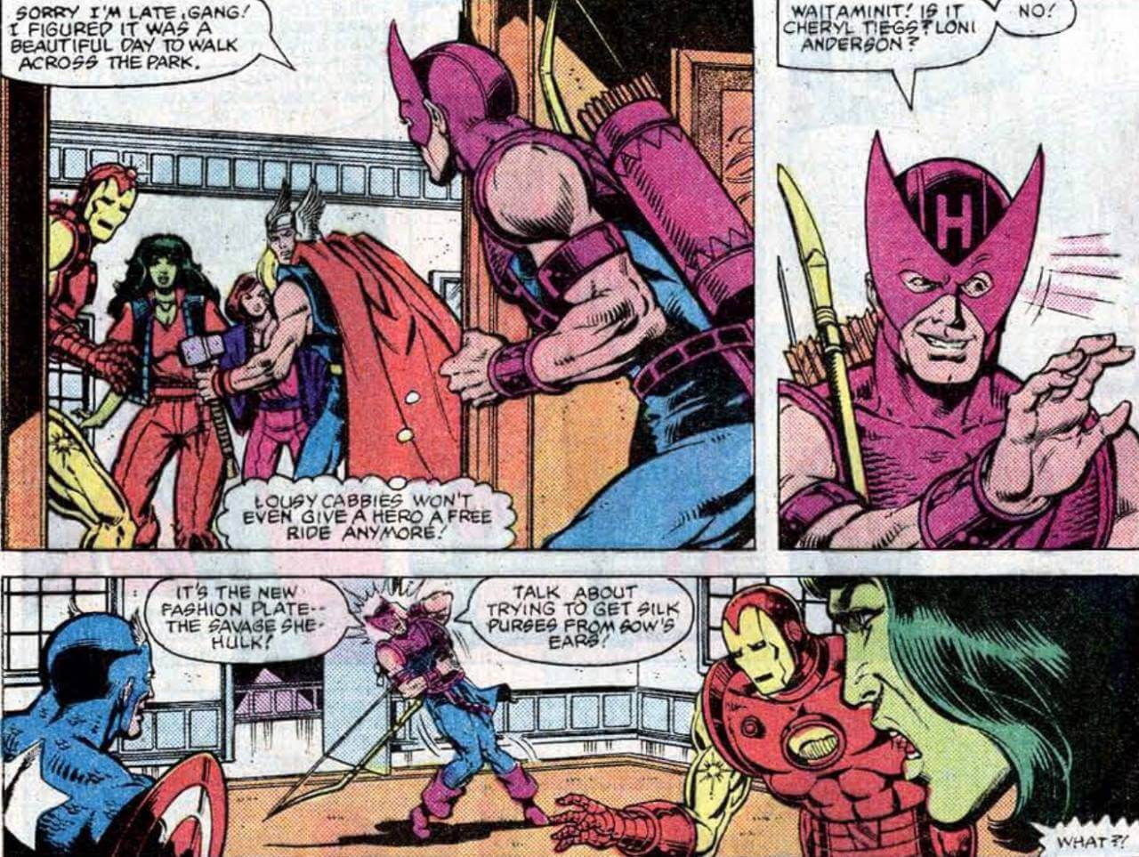 It’s also worth noting how Wasp and Hawkeye, in addition to She-Hulk, get lots of screentime in this issue (and others from this period). The other main characters, Cap, Iron Man and Thor, had their own solo books, but this was the only place you could read about these other heroes. It was special—another thing missing from today’s books, where there’s an event every six weeks so you see all the Marvel characters assembling all the time.