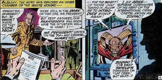 Aries of the Zodiac gang single-handedly captures and holds hostage the entire city of New York. Daredevil helps free it. There are cameos where Peter Parker and the FF can’t help for various, stupid reasons.