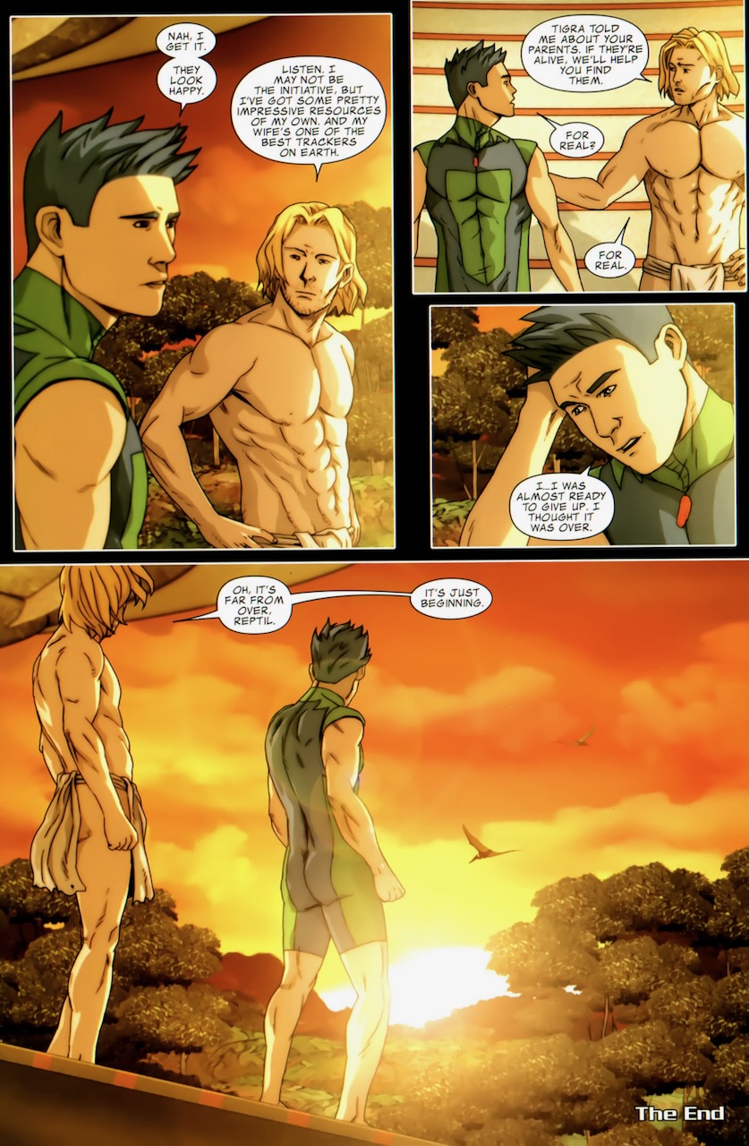 In the end, Ka-Zar shows up and Reptyl decides to go with the whole group to the Savage Land.  Once there, Ka-Zar offers to help find Reptyl’s parents, who were lost in the Savage Land.  Tigra covers for the disappearance of Moonboy by telling SHIELD that he was eaten by one of Stegron’s dinosaurs.