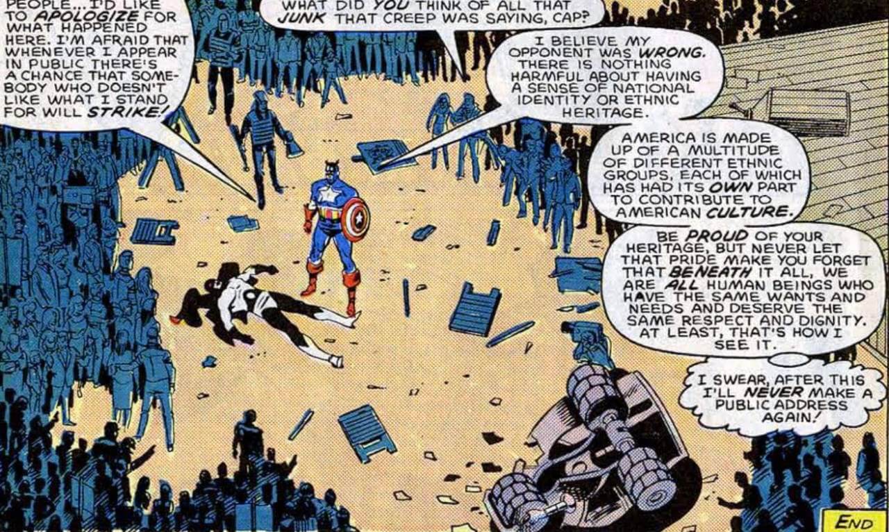 Honestly, this feels like an early 1970s issue of Cap. It’s not bad, but the series has kind of moved past sledgehammer symbolism and massive speeches, and regressing to that feels out of place. (Despite what Cap thinks to himself in the panel above, this will not be the last time he makes a public statement.)