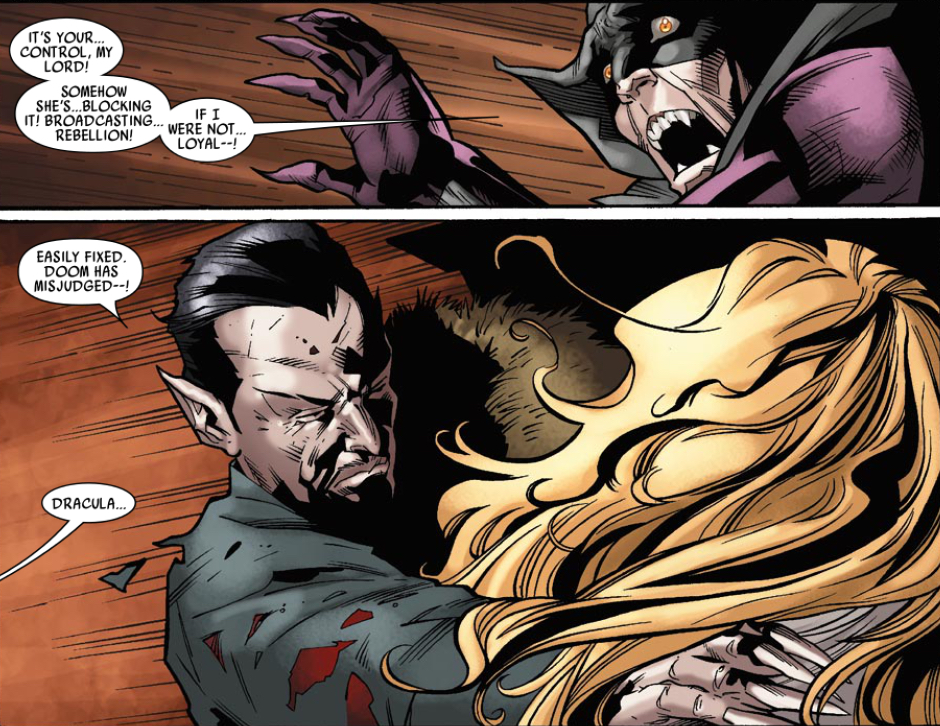 The big turning point happens when Dracula takes Captain Britain’s wife, Meggan.  But she, too, is capable of shrugging off Drac’s control–and signals her location to her husband…