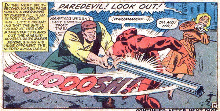 On this page, we see Foggy is still having symptoms from the traumatic brain injury he incurred in Ox’s first appearance (which Stan fails to remind us in a cute little box happened in Daredevil #6—very uncharacteristic of Lee, who was usually a huge fan of footnotes and crossreferences).