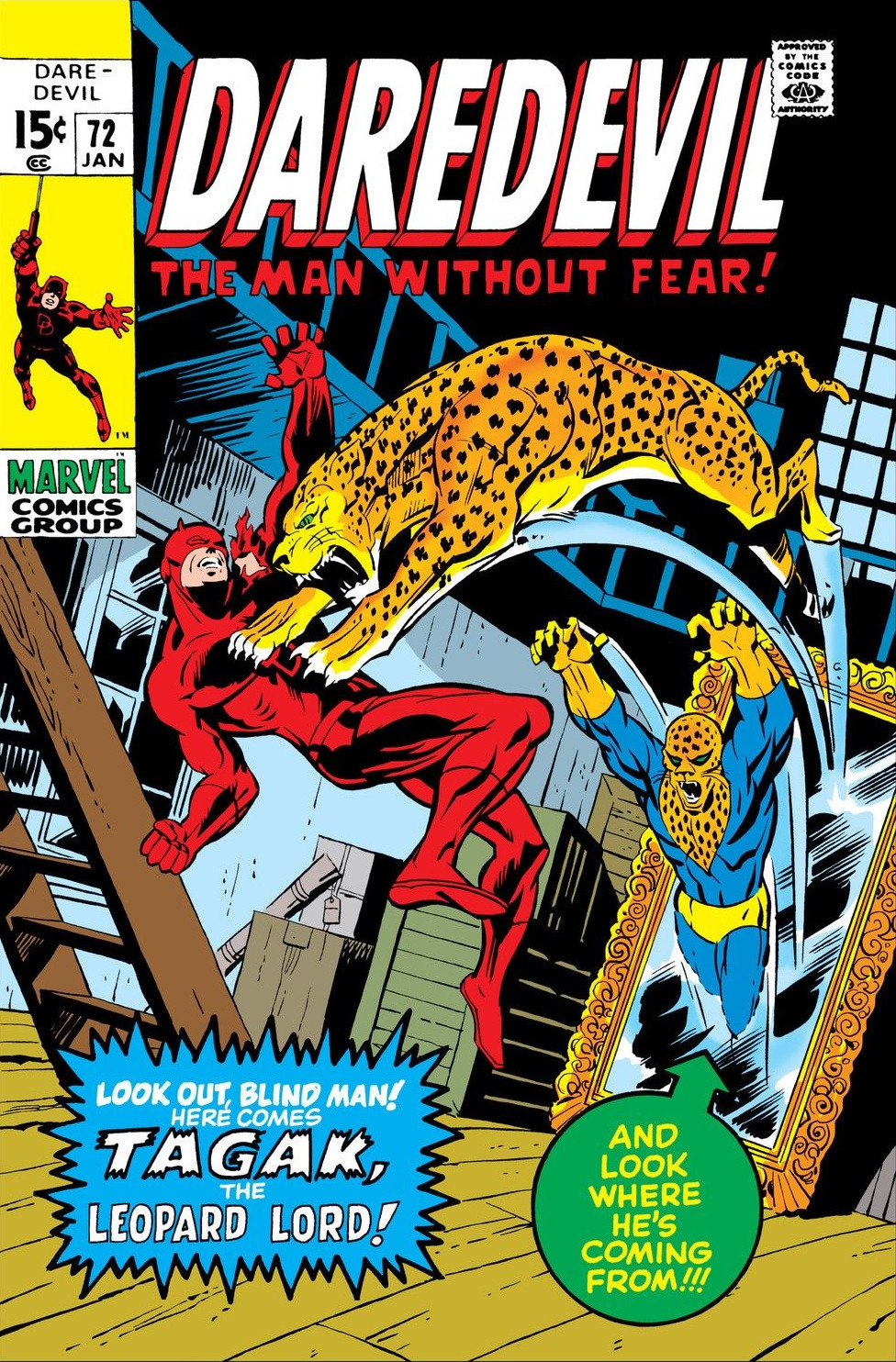 Gerry Conway’s first issue of Daredevil is bizarre. Tagak, leader of an extradimensional clan of blind leopard people who live behind our world’s mirrors and have seeing-eye leopards, arrives in our world tracking Quothar, who stole the sacred Krill statue. It is … Not good.