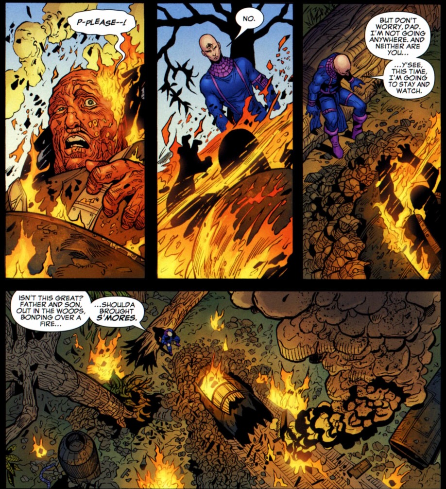 Eventually, we get a plot: Bullseye’s father is back, is now a terrorist known as Kingmaker, and is messing with his son.  And so is Solo, who was hired by Osborn to kill-and-replace Bullseye as Hawkeye.  Hawkeye blows his father up and watches him burn to death.