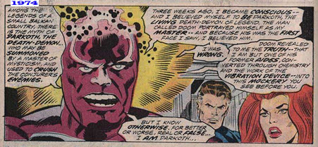 It sucks that Doom is being debased like this.  Also, Darkoth learns that he’s not a death demon after all–he’s an old friend of Ben Grimm from Yancy Street who was kidnapped and mutated by Doom.