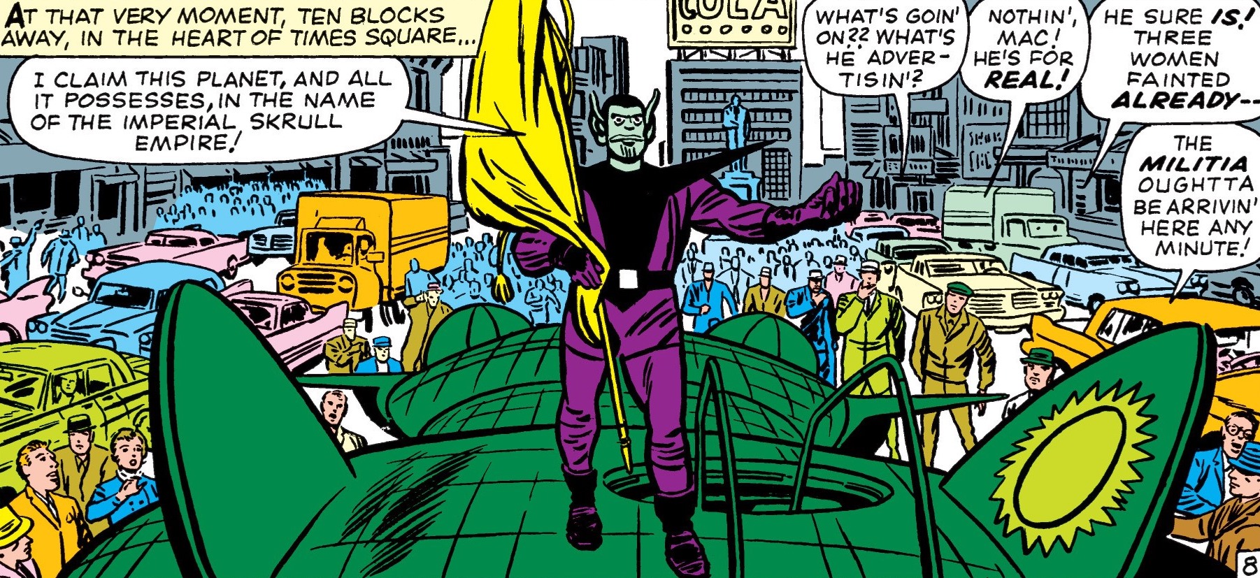 Super Skrull lands in Times Square and announces his intention of global conquest.