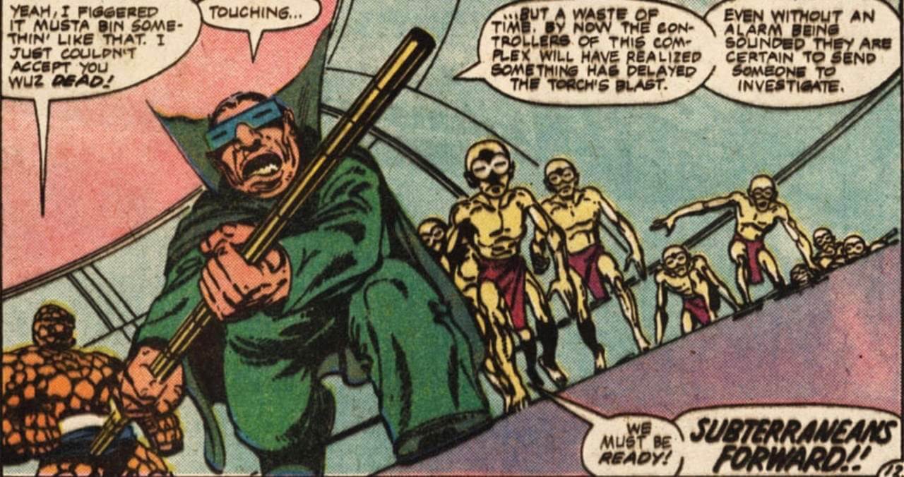Meanwhile, the underground constructs he will use to direct the captive Human Torch’s energy disrupt Mole Man’s home, so he appears as part of the adventure.
