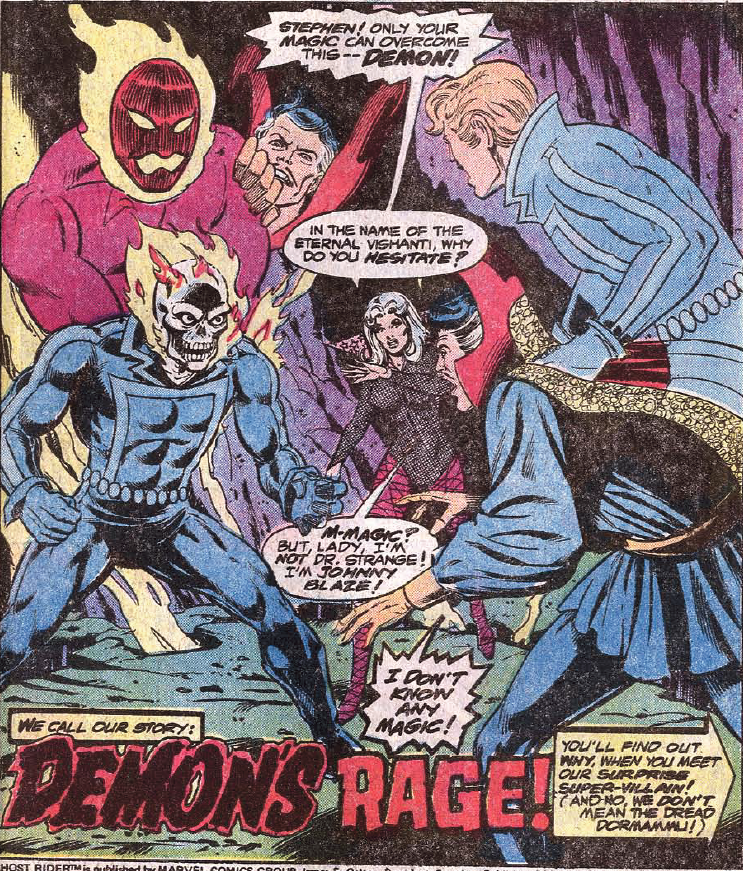 Dormammu tricks Ghost Rider into fighting Dr. Strange by attacking him with a fake Strange illusion. Ghost Rider then goes after the real Doctor, and then, while they are together, Dormammu does a mind switch, putting Johnny Storm’s consciousness inside Dr. Strange’s body and taking over Blaze’s body for himself.