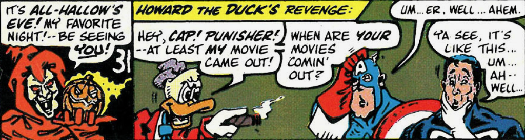 From October 1990’s calendar on the back of Marvel Age. I like Howard dissing Cap and Punisher about their movies.