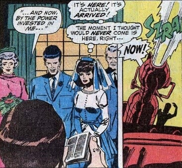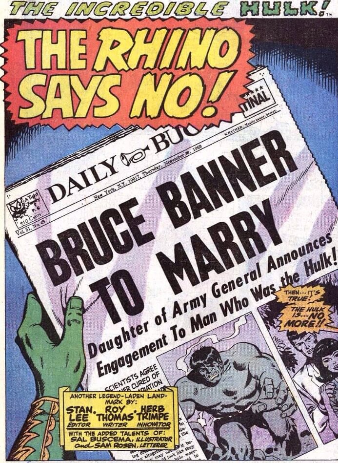 The cover tag is “The Wrath of the Rhino,” but the splash page has the real title of this issue: “The Rhino says no!” right over a Daily Bugle headline about Bruce and Betty getting married. Very cool juxtaposition. Hilarious.