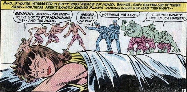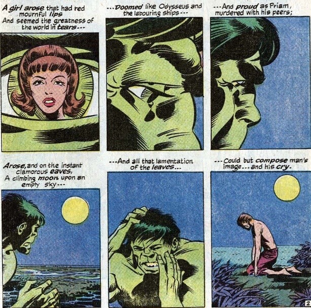 We also see Herb Trimpe getting artsy, which is cool. There’s a terrific dream sequence with Betty sleeping under ghostly figures of Hulk, Bruce, her father, etc., and this sequence of the Hulk-to-Banner transformation that focuses on the inner transformation instead of going green to flesh.