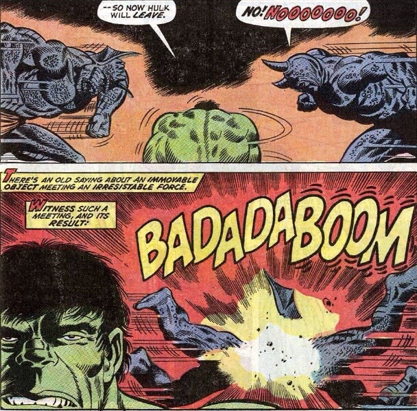 Abomination and Rhino go after Hulk at the same time and he ducks. Yeah, it’s an old joke. But it still works.