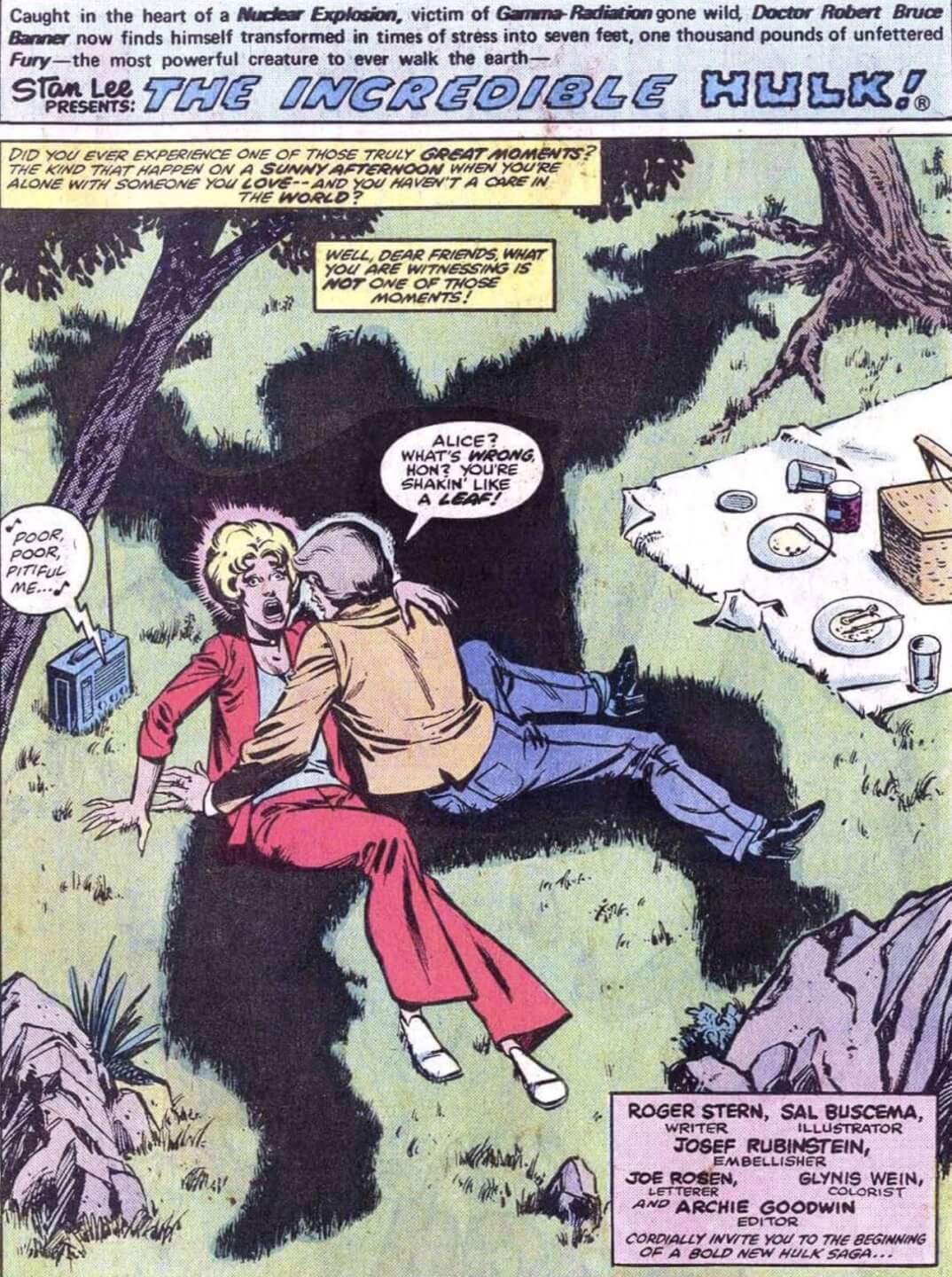 For the first time in a while, Hulk gets really, really good. It starts with this ominous splash page of Hulk getting ready to literally crash a picnic. But when he lands, he finds himself changing into Bruce Banner suddenly and without warning…