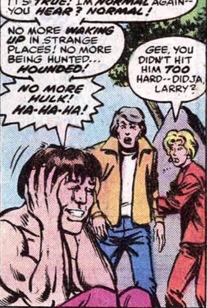 He’s so happy, he doesn’t even defend himself when one of the picnickers punches him in the jaw. And when the punch doesn’t cause a Hulk transformation, his joy only further increases.