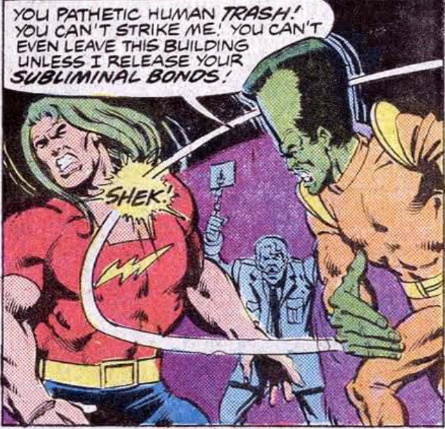 These issues also use a Banner-meeting-Hulk-inside-the-mind sequence, something that will become increasingly common in this comic–and used very well by Bill Mantlo, when he began exploring Banner’s childhood influences on the manifestation of a Hulk persona.