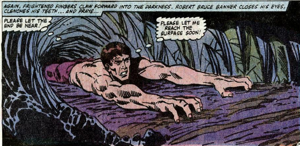 Of course, Banner changes to Hulk and there’s a big battle that ends with Crusher Creel absorbing Easter Island, “disproving the adage that no man is an island.”  Nice, ironic twist!
