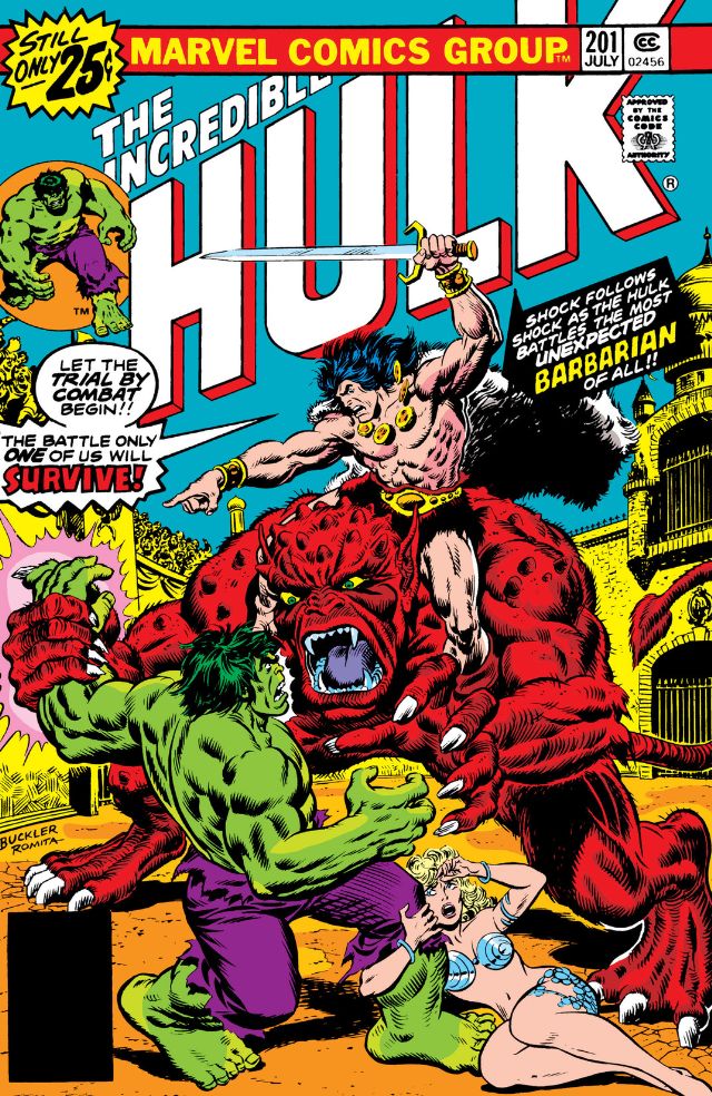 We start with #201, where Hulk fights Conan. OK, not really. It’s “Kronak the Barbarian.” But this is clearly an attempt to get readers interested in reading about a shirtless, sword-wielding barbarian at a time when Marvel was launching a Conan comic.
