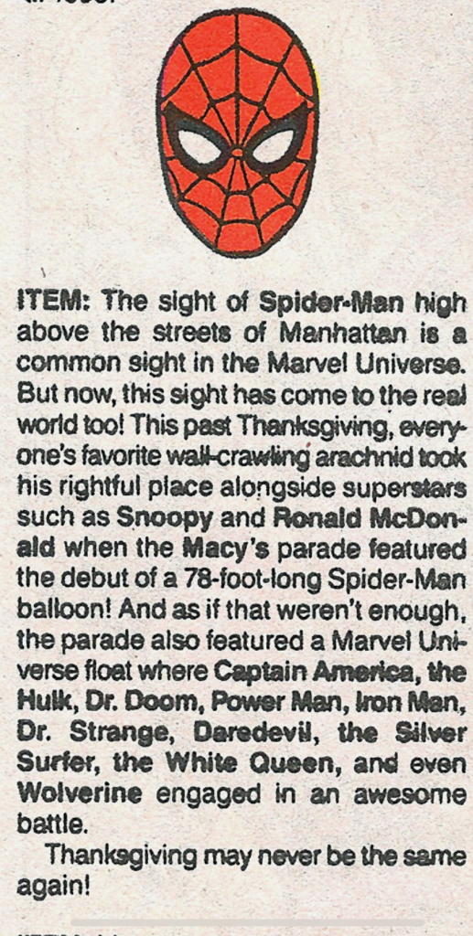 A blurb from Marvel Age about the Spider-Man balloon and the Marvel float.