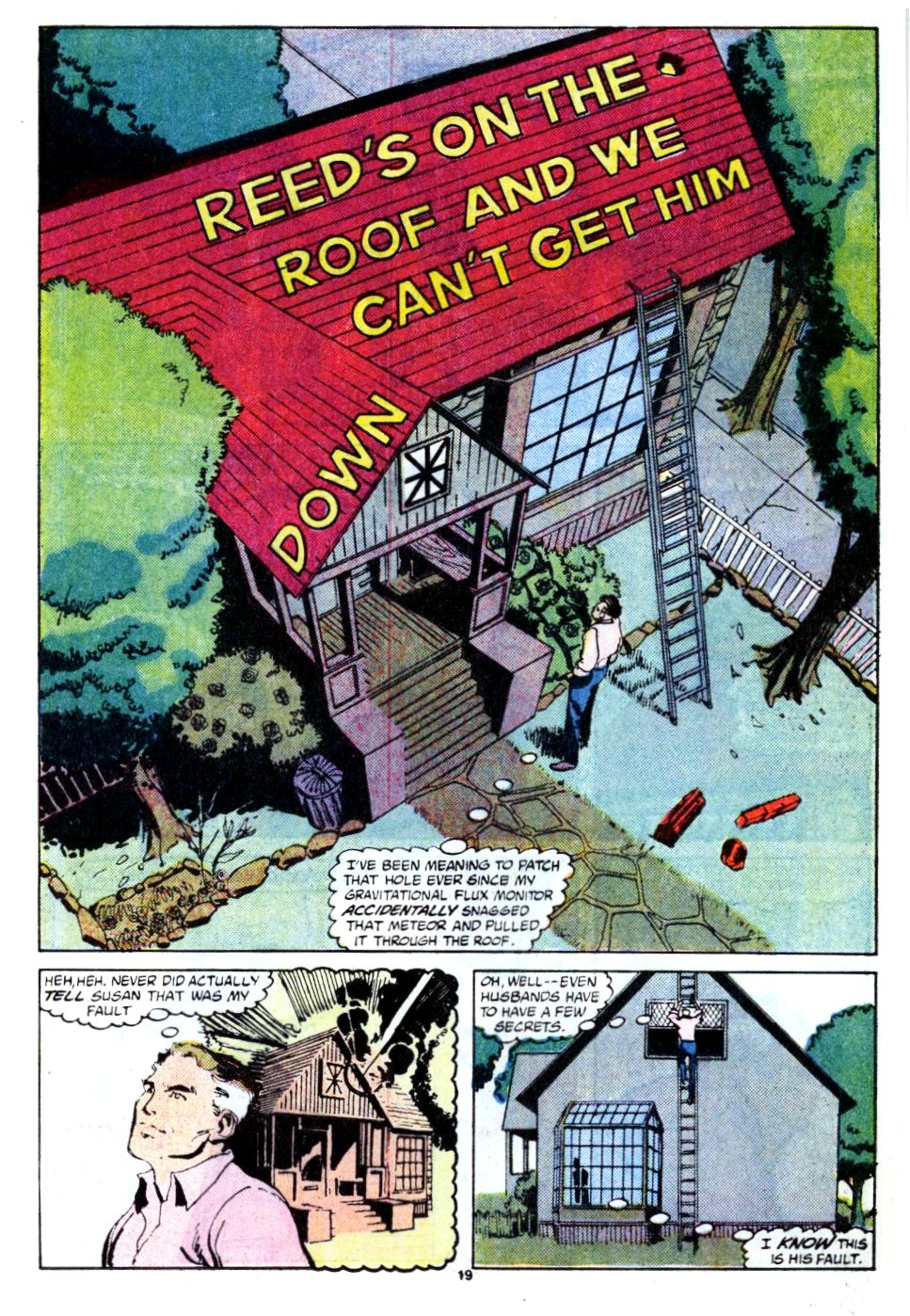 At the time the first one-issue story in MCP#15 takes place (MCP has 4 stories, but two are parts of serialized tales and are covered elsewhere), Sue and Reed have quit the FF and moved to the suburbs to raise Franklin incognito. Reed goes up on the roof to fix some shingles, but can’t use his powers because, again, they’re incognito. He ends up stuck on the roof. He ends up falling off and holding on to the eaves for dear life, relying on neighbors to solve his problem.