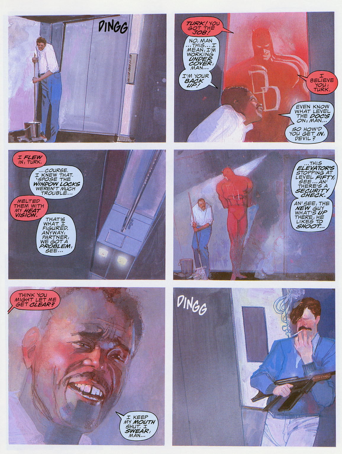 The art is abstract watercolor, similar to what Sienkiewicz would use in the upcoming Elektra: Assassin miniseries (also with Miller, and even more abstract and challenging), and the writing is some of Miller’s most novelistic. It makes for a hard read at times—you have to work with the material—but it’s well worth the effort. This is exactly what graphic novels should be.