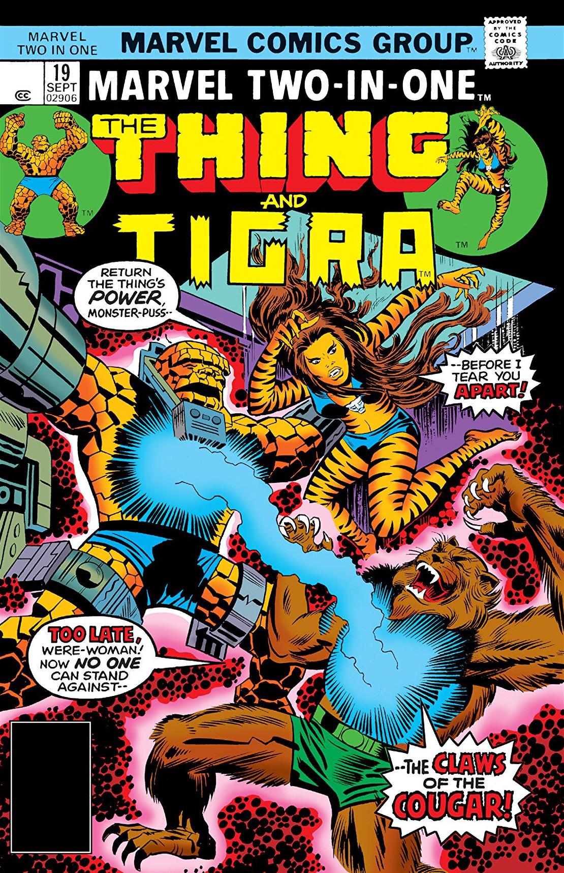 When she first came on the scene, it was in a story called “Claws of the Cat.” Now, she’s a cougar: “Claws of the Cougar!” Actually, The Cougar is the villain, one of the race of cat people that turned Greer Nelson into Tigra, and Tigra needs Thing’s help to stop him from using cat-people powers for evil.