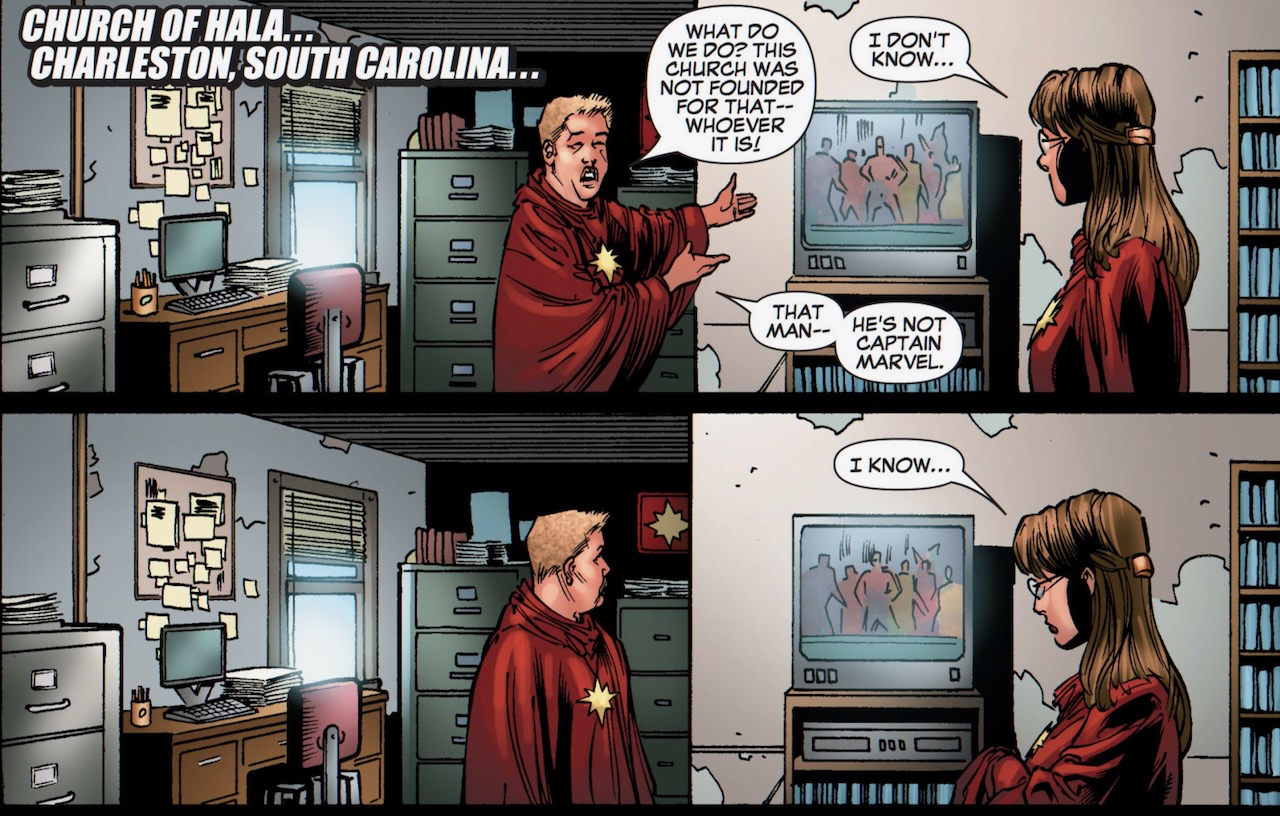 This is interesting. Ms. Marvel was initially created as the female version of Captain Marvel, whose title has been used by several people since then. Most recently, Noh-Varr took the Captain Marvel identity to serve on Norman Osborn’s Avengers team. This story explores the “Marvel” identity in several ways, starting with Ms. Marvel confronting Noh-Varr about his identity, and he reveals to Carol that the hero of the Hala religion (a) is dead and (b) was a skrull. Meanwhile, the Brotherhood of Hala–a religious group formed to worship the resurrected original Captain Marvel who, unbeknownst to all, was actually a skrull.