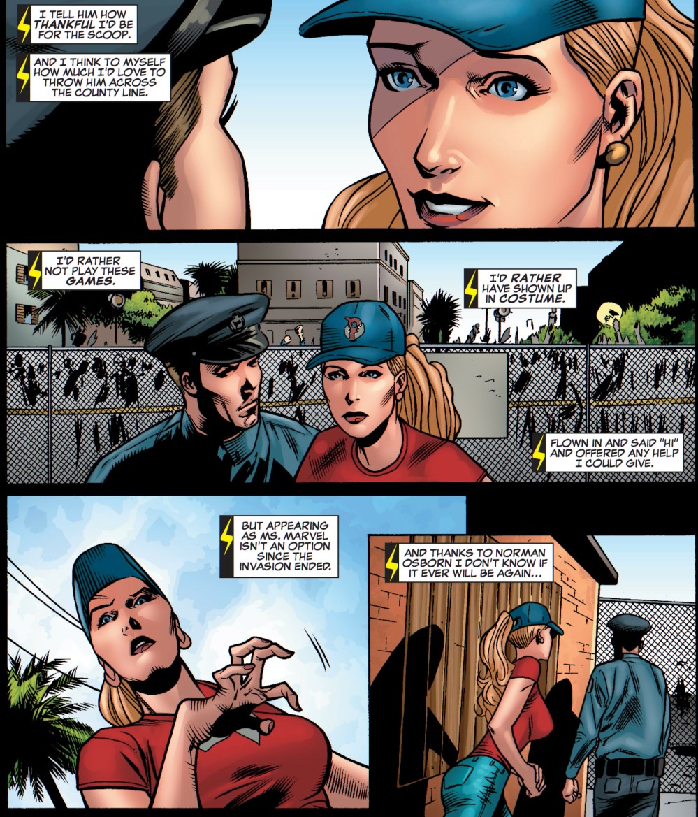 When the monks see that their hero’s identity has now been taken by Blue Marvel to serve Osborn, they commit mass suicide. Meanwhile, owing to Osborn taking the Marvel name for his evil team, goes into hiding under a new identity, reporter Catherine Donovan.