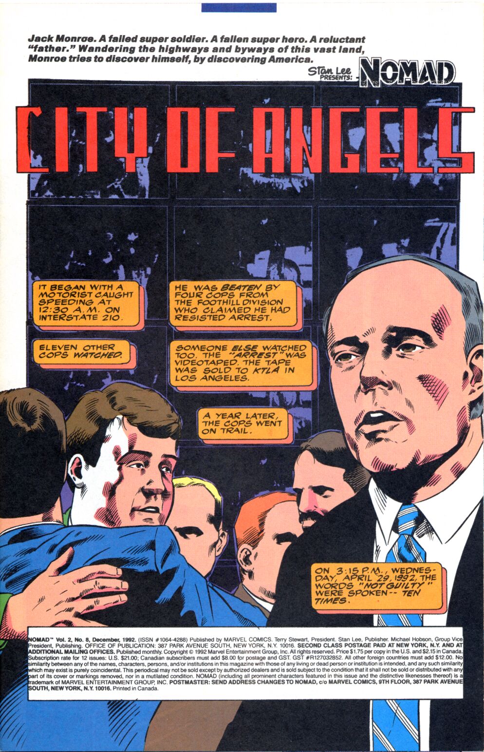 In issue #8, Nomad is in Los Angeles during the Rodney King riots of 1992. A very interesting idea, merging the then-current event and the pseudovigilantism of the riots with a street character, but reading it now is hard. Seeing a story written by a white male and telling the white, albeit sympathetic, story of the riots feels…Icky. And I’m guessing it was icky back in 1992 as well, since there are no credits listed for the issue.