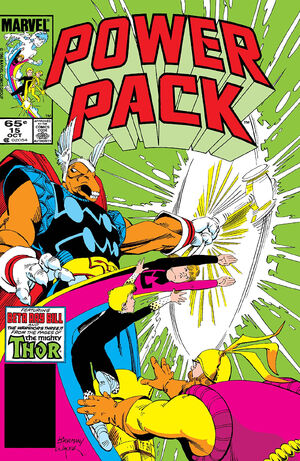 Loosely tying into her husband’s Thor book, Louise Simonson pens a story where the Power Pack meet members of Asgard’s Warriors Three. Julie is unhappy with her siblings and decides to run away to Asgard by stowing away on Volstagg, when The Bogeyman (the villain from last issue) blows it for her. Power Pack fight Bogeyman and eventually Hogun helps them.