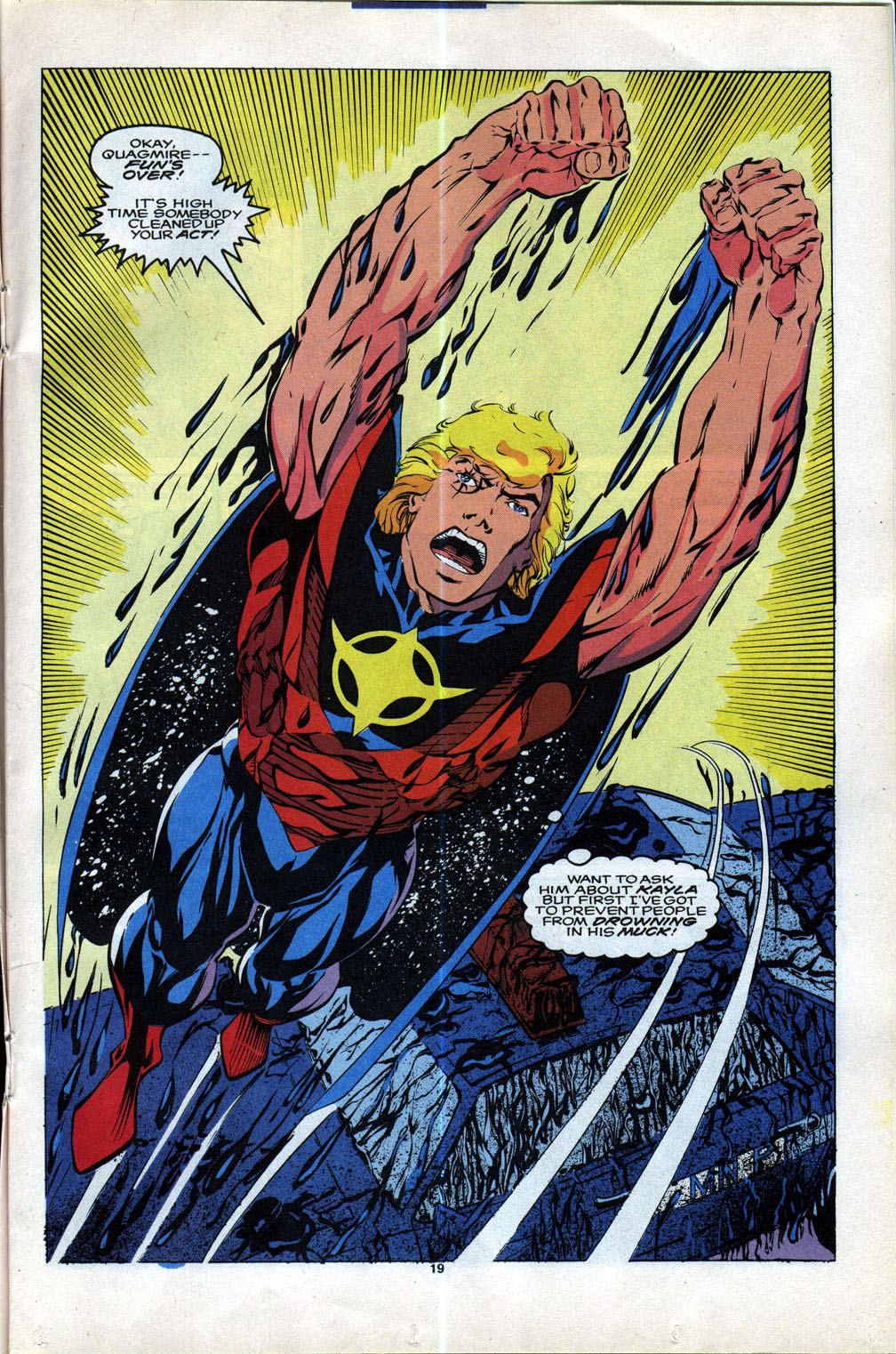 When we last saw Quasar, he was imprisoned in another dimension and lost his Quantum Bands, but he found the starbrand–officially bringing Jim Shooter’s failed New Universe project into the 1990s. He comes back to Earth with his new power source and literally flies straight through his old enemy Quagmire.