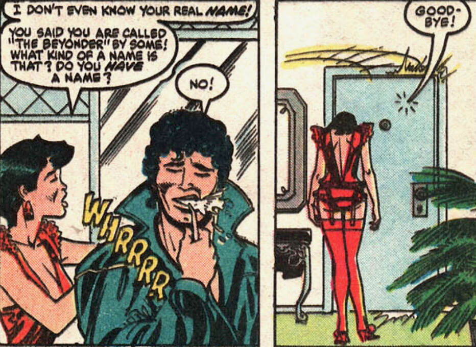 Last Issue, Beyonder learned about money and power by becoming a crimelord and literallyi taking over every molecule on Earth. This issue, he learns about love by being a cad. He gets a booty call, brushes his teeth, and leaves.