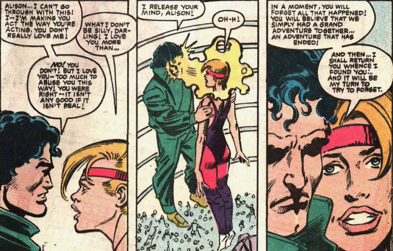 Anyway, Beyonder realizes he needs a woman with a little more backbone, so he goes after Dazzler. In her own book, at least in the early issues, Allison jumped from guy to guy, so it makes sense that she might fall for Beyonder, too. Also, he spares no expense, creating horse-drawn carriages, turning asteroids into diamonds, etc., to impress her. When nothing works, he does a Purple Man on her—forcing her to love him—until he realizes that love has to be voluntary and he frees her. (He had a chick who loved him so much she’d die for him—why wasn’t that enough?) Anyhow, the story is elaborated upon in the next issue of Dazzler.