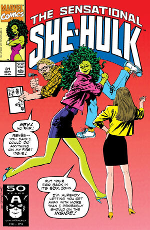 But she does dress for the occassion. (Note John Byrne taking a shot at Jim Lee.)