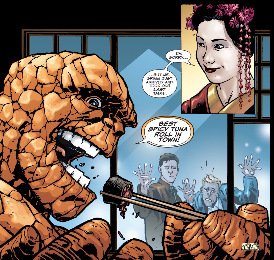 This is followed by a brief Iceman team up by a writer who goes by “Blambot’s Nate Piekos.” The art is by another one I’ve never heard of, Zach Howard. It’s also mediocre but it does have a random Thing panel that I liked…