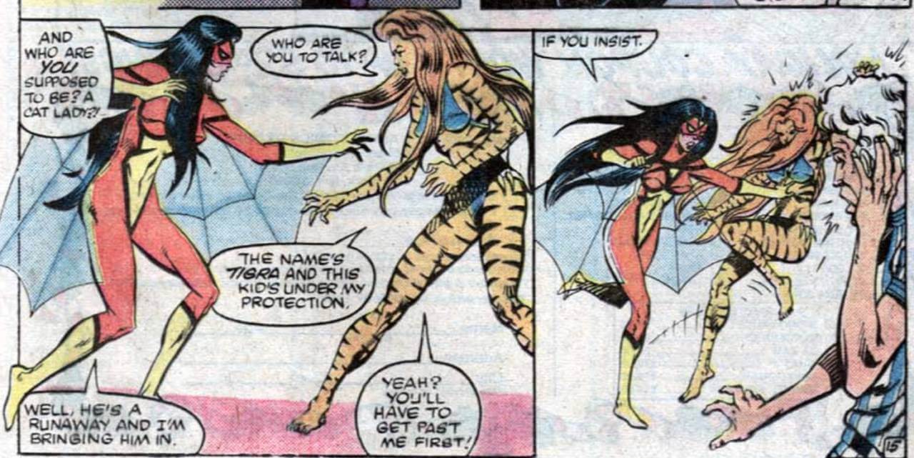 Tigra and Spider-Woman take a newly emerged mutant teen under their wings, but first they fight over him. Sadly, the kid never really goes anywhere.
