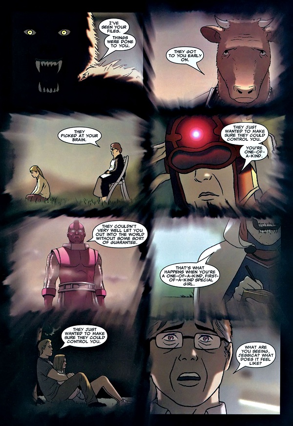 Strong ties are drawn between Jessica Drew and Hydra Wundagore Mountain experiments. Miles Warren is revealed to be one of the scientists who helped create her, thus also strengthening her ties to the Spider-Man universe. We see that she was bombarded with experimental radiation while still in her mother’s womb, and her father was one of the scientists working on these Hydra projects.