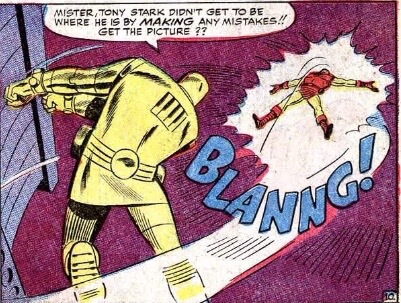 a thief steals Tony Stark’s briefcase, which apparently isn’t locked or otherwise protected, and gets Tony’s armor, so Tony puts on his old suit and it’s Iron Man vs. Iron Man.