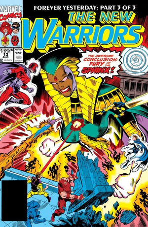 The New Warriors get an alternate reality/time travel story as The Sphinx returns as a female (there’s been a subplot brewing for several issues prior), she’s the Queen of the World, and the Avengers are her allies. And Captain America wears a skirt.