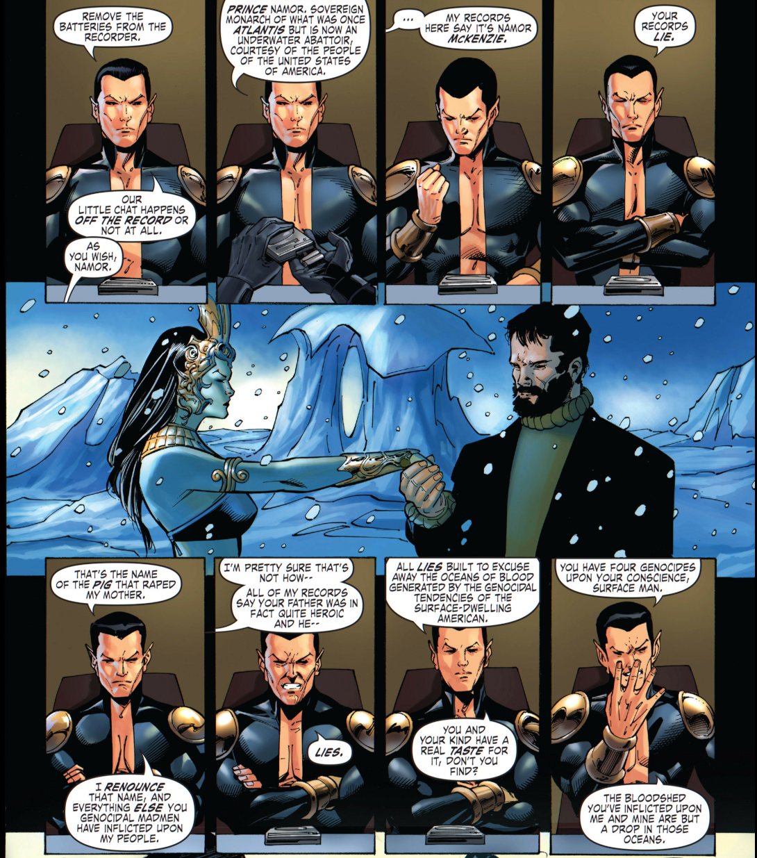 The issue retcons Namor’s origin so that instead of his Atlantean mother falling in love with his human father, McKenzie is actually a rapist who impregnated Namor’s mother before the Atlanteans could rescue her. That Namor believes this to be true makes quite a bit of sense as it explains Namor’s endless war against the surface world.