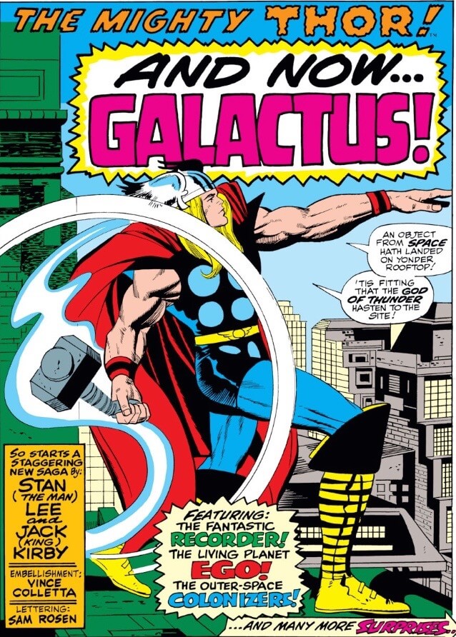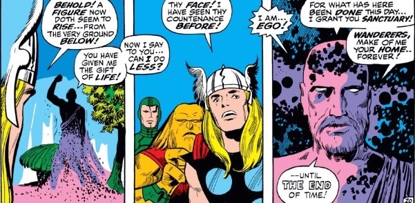 Oh, and Galactus tries to eat Ego, the Living Planet. That’s a neat little sequence. Ego’s power boosts Thor’s own, which enables Thor to beat up Galactus. Yes, in this comic, he takes on the big G mano-a-mano and wins. That never happens again. But we get to see Ego manifest a “human” form for the first time, on the surface of the planet, just like he did in the recent Guardians of the Galaxy 2 movie…