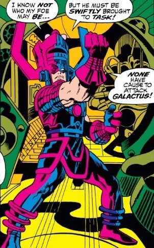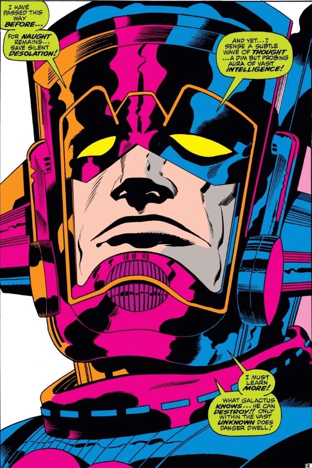 We also get yet another take on Galactus’ costume. In this story, he doesn’t wear a kilt with shorts, he’s got two-toned long pants and a short-sleeved shirt. I suppose it doesn’t matter, really. We all change our clothes every day, after all. Most days, anyway. Which reminds me of how Stan Lee sometimes thought to have Spider-Man wash his costume. Who else thinks of things like that?!