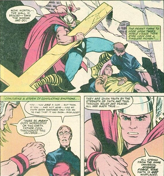This is a strange issue: Some members of the mob are muscling in on a church, so Thor helps them. We don’t usually see him doing street jobs, and the choice to have him save a Christian-based church is an interesting one. It could have been much more interesting, of course, being that this is 1981 and Marvel still isn’t allowing its comics to get too deep. There is a sequence, above, where Thor tells the priest that all Gods are derived from the same energy source. One the one hand, that seems a little bit like Western cultural appropriation of polytheism. On the other hand, “all are one” is a pretty Eastern way of thinking.